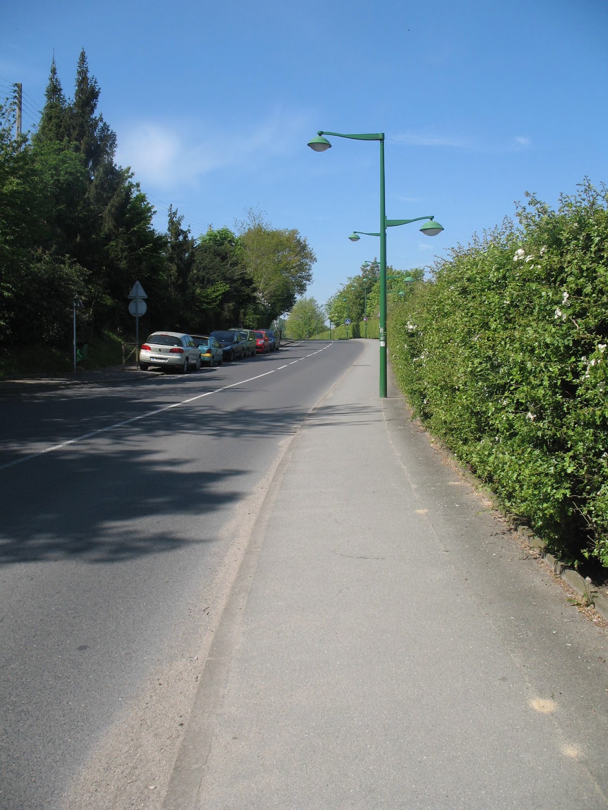 | After passing the residential area and this long stretch of tree-bordered street, I would have been walking about 12 minutes. Notice the gradual upward ascent! |